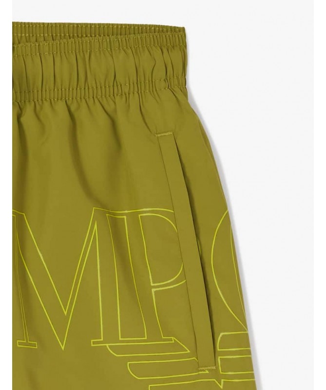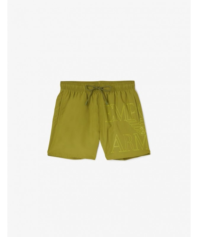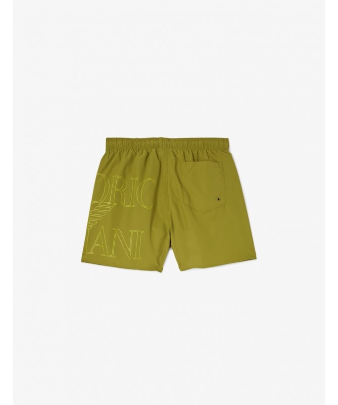 Costume da bagno uomo modello shorts Emporio Armani con coulisse in vita, maxi logo stampato sul lato, tasche laterali e tasca posteriore. In poliestere riciclato.