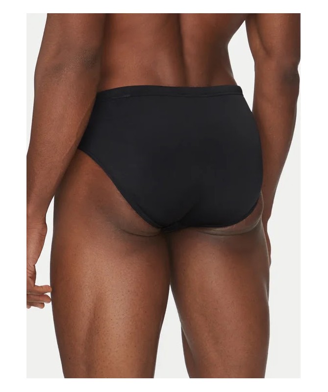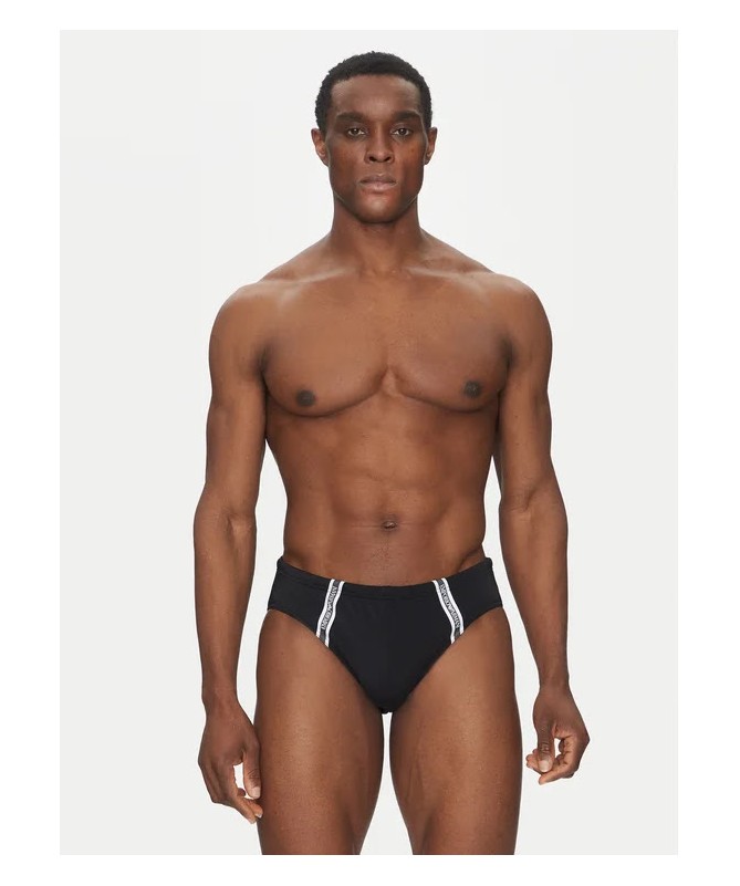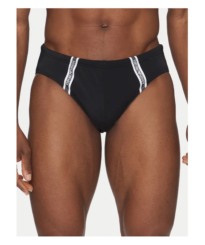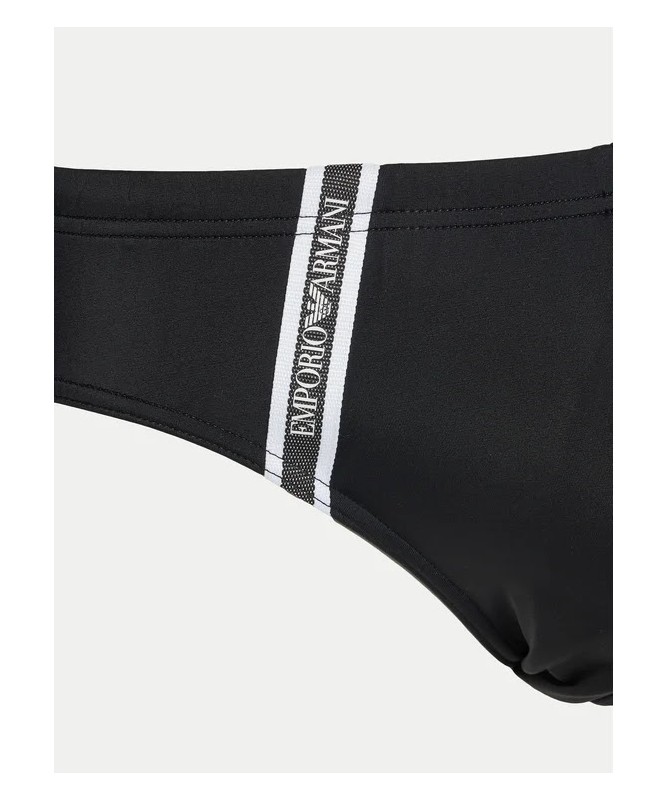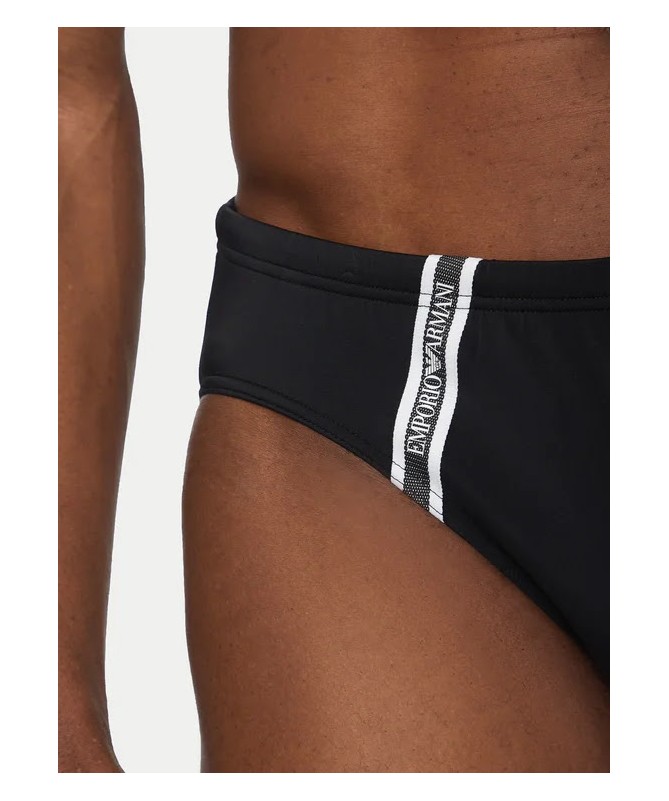 Costume da bagno uomo modello slip Emporio Armani a vita elastica con tape logato sui lati. Realizzato in tessuto stretch con nylon riciclato per comfort e sostenibilità.